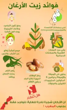 إن هذا الزيت استخدم منذ القدم من قبل النساء الأمازيغيات كمرطب للبشرة الجافة وكمضاد للتجاعيد، وذلك لاحتوائها على الأحماض الدهنية الأساسية، الأوميغا-6، الأوميغا-9 ومضادات الأكسدة وجفاف البشرة، وفي مستحضرات التجميل يستعمل زيت الأركان كمضاد لحب الشباب، مضاد للصدفية، مضاد لاحمرار الجلد كما أنه مضاد للتجاعيد ومرطب للبشرة.