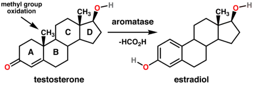 ![]() رد فعل عامة لتحويل هرمون التستوستيرون إلى استراديول يحفزه الهرمونات. وتتكون المنشطات من أربعة تنصهر الخواتم (المسمى م). الهرمونات تحويل خاتم المسمى "A" إلى العطرية الرئيسية. |