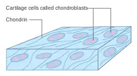 ![]() رسم يبيّن خلايا الغضروف التي تُسمى أرومة غضروفية (بالإنجليزية: chondroblasts). | |