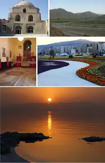 ![]() أعلى اليمين: القبة الخضراء مع مئذنة باب السلام، أعلى اليسار: جامع أرومية، في الوسط على اليسار: كنيسة أرومية، في الوسط على اليمين: منظر لبعض الزهور في شوارع أرومية، في الأسفل: شروق الشمس من بحيرة أرومية | |