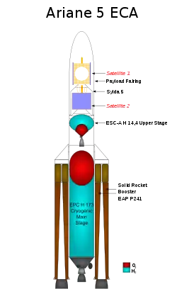 - صاروخين لتعضيد الإطلاق يعملان بالوقود الصلب. يتكون كل واحد منهما من 3 أجزاء، وطول كل جزؤ 75و24 متر ويباغ قطر كل منهما 0و3 متر ويلغ سمك جدار الصاروخ 8 مليمتر، ويزود ب 238 طن من الوقود. والجزء العلوي من صاروخي التعضيد هو أقصر جزء ويصنع ويعبأ في كوليفيرو بإيطاليا. وتجرى تعبئة الجزئين التحتيين في القاعدة وقت الأطلاق.