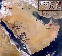 تواجدت قبائل الأزد في جنوبي بلاد الرافدين في الحيرة وماجاورها ولقد كانوا أحد القبائل العربية المكونة لما عُرف بحلف تنوخ[65]، وامتدت ديارهم إلى جنوبي الأردن داخل مملكة الأنباط[66]، وجنوب سوريا الذي أسس فيه أبناء جفنة من بني غسان مملكتهم المعروفة بمملكة الغساسنة[67]، واتخذوا يُصرى عاصمة لهم وأمتد نفوذهم إلى التخوم الشمالية للحجاز.