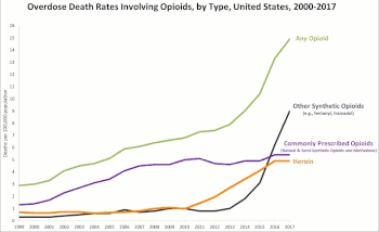 على الرغم من زيادة استخدام المسكنات، إلا أنه لم يحدث أي تغيير في نسبة حالات الألم المزمن المبلغ عنها في الولايات المتحدة.[16][17] ومع ذلك، أصبح وباء الأفيون الحالي أسوأ أزمة مخدرات في التاريخ الأمريكي. توفي أكثر من 33,000 شخص بسبب الجرعات الزائدة في عام 2015، أي ما يعادل تقريبًا عدد الوفيات الناجمة عن حوادث السيارات، مع وفيات من الهيروين وحدها أكثر من حوادث القتل.[18] كما أنه يترك الآلاف من الأطفال يحتاجون فجأة إلى الرعاية البديلة بعد وفاة والديهم بسبب الجرعات زائدة مما يخلق مشكة جديدة خاصة بهؤلاء الأطفال اليتامى.[19]