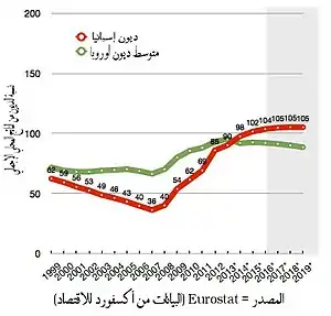 وقد أدت عمليات الإنقاذ المالي للبنك والأنكماش الأقتصادي إلى زيادة مستويات العجز والديون في البلد وأدت إلى خفض كبير في تصنيفه الائتماني وبغية بناء الثقة في الأسواق المالية بدأت الحكومة في تطبيق تدابير التقشف وفي عام 2011 أصدرت قانونا في الكونغرس للموافقة على تعديل للدستور الأسباني يتطلب ميزانية متوازنة على المستويين الوطني والإقليمي بحلول عام 2020.[147] وينص التعديل على أن الدين العام لا يمكن أن يتجاوز 60 في المائة من الناتج المحلي الإجمالي على الرغم من أنه سيجري استثناءات في حالة حدوث كارثة طبيعية أو ركود اقتصادي أو حالات طوارئ أخرى.[148][149] وباعتبارها واحدة من أكبر اقتصادات منطقة اليورو (أكبر من اليونان والبرتغال وأيرلندا مجتمعة) [150] فإن حالة الاقتصاد الإسباني تشكل مصدر قلق خاص للمراقبين الدوليين تحت ضغط من الولايات المتحدة وصندوق النقد الدولي ودول أوروبية أخرى والمفوضية الأوروبية [151][152] ونجحت الحكومات الإسبانية في نهاية المطاف في خفض العجز من 11.2٪ من الناتج المحلي الإجمالي في عام 2009 إلى 7.1٪ في عام 2013.[153]