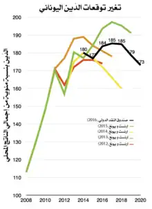 شهدت اليونان نموا اقتصاديا إيجابيا في كل من الأرباع الثلاثة الأولى من عام 2014.[102] وعودة النمو الاقتصادي جنبا إلى جنب مع فائض الميزانية الهيكلي القائم حاليا في الحكومة العامة وبناء الأساس لنسبة الدين إلى إجمالى الناتج المحلي لبدء انخفاض كبير في السنوات المقبلة [103] مما ستعتبر اليونان "مستدامة للديون" وتستعيد بالكامل إمكانية الوصول الكامل إلى أسواق الإقراض الخاصة في عام 2015. [lower-alpha 1] في حين يتوقع أن تنتهي أزمة الحكومة والديون اليونانية رسميا في عام 2015 فإن العديد من تداعياتها السلبية (مثل ارتفاع معدل البطالة ) من المتوقع أن يتم الشعور بها خلال العديد من السنوات اللاحقة.[103]