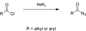 تتفاعل مركبات كلوريد الأسيل الأريلية والأليفاتية مع أزيد الصوديوم في محاليل مائية لتعطي أسيل الأزيد، [5][6] والذي يعطي الإيزوسيانات من خلال إعادة ترتيب كورتيوس Curtius rearrangement: