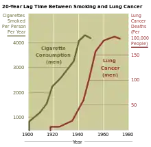 يرتبط تدخين التبغ بالعديد من أشكال السرطان،[18] ويسبب 80٪ من حالات سرطان الرئة.[19] أظهرت عقود من الأبحاث العلاقة بين تعاطي التبغ والسرطان في الرئة والحنجرة والرأس والعنق والمعدة والمثانة والكلى والمريء والبنكرياس.[20] هناك بعض الدلائل التي تشير إلى زيادة صغيرة في خطر الإصابة بسرطان الدم النخاعي وسرطان الجيوب الأنفية الحرشفية وسرطان الكبد وسرطان القولون والمستقيم وسرطانات المرارة والغدة الكظرية والأمعاء الدقيقة وسرطانات الطفولة المختلفة. يحتوي دخان التبغ على أكثر من خمسين مادة مسرطنة معروفة، بما في ذلك النتروزامين والهيدروكربونات العطرية متعددة الحلقات. يعد التبغ مسؤولاً عن واحد من كل ثلاثة حالات وفاة بالسرطان في العالم المتقدم، وحوالي واحدة من كل خمس وفيات في جميع أنحاء العالم.[21] عكست معدلات الوفيات الناجمة عن سرطان الرئة في الولايات المتحدة أنماط التدخين، حيث الزيادة في معدلات التدخين تليها زيادات كبيرة في معدلات الوفيات بسرطان الرئة، وفي الآونة الأخيرة، أدى الانخفاض في معدلات التدخين منذ عقد الخمسينات إلى انخفاض في معدلات الوفيات بسرطان الرئة لدى الرجال منذ عام 1990.[22][23] ومع ذلك، لا يزال عدد المدخنين في جميع أنحاء العالم في ارتفاع، مما أدى إلى ما وصفته بعض المنظمات بأنه "وباء التبغ".[24]