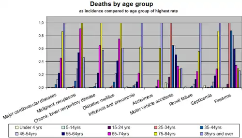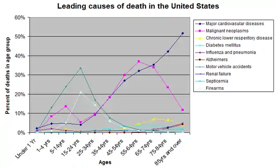 تعود بيانات الجدول التالي لعام 2002، يمكن الحصول على بيانات الوفيات الأحدث (من 2010 للولايات المتحدة فقط) من الموقع CDC.