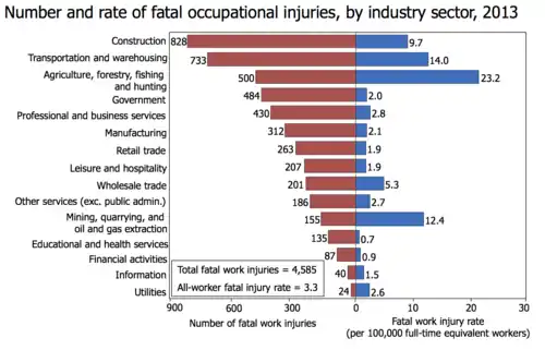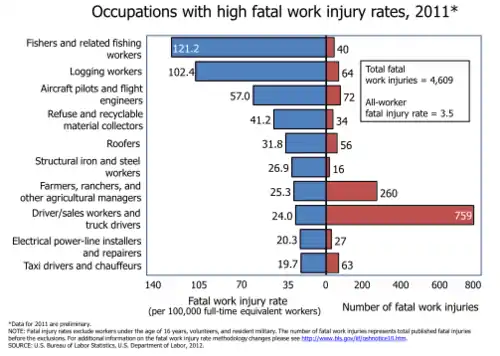 With an average of 123.6 deaths per 100,000 from 2003 through 2010 the most dangerous occupation in the United States is the برج (عمارة) industry.[12]