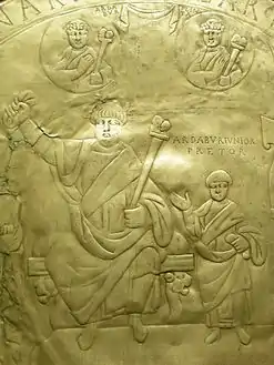 تفاصيل على ميسوريم (طبق فضي) آسبار، يصور آسبار وابنه الأكبر أردابور (Ardabur) (حوالي 434).