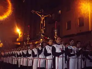 يتعلق الاحتفال في أسبوع الآلام بالتقوى الشعبية والتي تعتمد بشكل حصري تقريبًا على المواكب التابعة للجمعيات أو الاخويات. هذه الجمعيات لها أصول تعود إلى العصور الوسطى، ولكن تم إنشاء عدد منها أيضًا خلال فترة الباروك، مستوحاة من الإصلاح المضاد وأيضا خلال القرنين العشرين والحادي عشر. عضوية الأخويات عادًة مفتوحة أمام أي شخص كاثوليكي، كما أن التقاليد العائلية هو عنصر هام لتصبح عضوًا أو "شقيق" (بالإسبانية: hermano).[1]