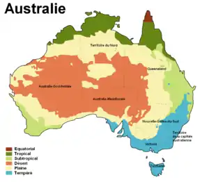 يتأثر المناخ في أستراليا بشكل كبير بتيارات المحيط —بما في ذلك ظاهرة قطبي المحيط الهندي وظاهرة النينو— التي ترتبط بالجفاف الدوري، والموسم الاستوائي ذو الضغط المنخفض المسبب للأعاصير في شمال أستراليا.[60][61] وهذه العوامل تساهم في نزول الأمطار التي تختلف بشكل ملحوظ من عام لآخر. يسود معظم الجزء الشمالي من البلاد المناخ الاستوائي ذو الأمطار الصيفية (الموسمية).[62] وثلاثة أرباع أستراليا تقع ضمن المنطقة الصحراوية أو شبه صحراوية.[63] ويعدّ الركن الجنوب غربي في الدولة ضمن إقليم البحر المتوسط المناخي، [64] ومعظم الجنوب الشرقي (بما في ذلك تسمانيا) ذو مناخ معتدل.[62]