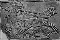آشوربانيبال على حصانه يدفع الرمح على رأس الأسد