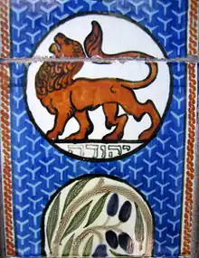 إن يهوذا التوراتية (بالعبرية: يهودا) هي سلف مسمى لقبيلة يهوذا، ويرمز إليها تقليديًا بالأسد. وفي سفر التكوين، قدم البطريرك يعقوب ("إسرائيل") هذا الرمز لهذه القبيلة عندما يشير إلى ابنه يهوذا بوصفه غور أرييه גּוּר אַרְיֵה יְהוּדָה، "الأسد الشاب" (التكوين 49:9) عندما باركه.[3] وفي تقليد التسمية اليهودي، غالبًا ما يتم الجمع بين الاسم العبري والاسم البديل كثنائي، كما في هذه الحالة. لقد تم استخدام أسد يهوذا كرمز يهودي لسنوات عديدة، ولأن أورشليم كانت عاصمة مملكة يهوذا، فقد تم تضمين الأسد في عام 1950 في شعار أورشليم.