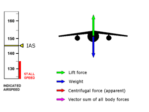 فإذا كان إجمالي الرفع ثابت، فإن ذلك سيقلل مجموعة الرفع العمودية. وبما أن وزن الطائرة ثابت ولم يتغير، فإن ذلك سيسبب بهبوط الطائرة descend. لذلك للمحافظة على مستوى الطيران يجب رفع الرافع للأعلى لزيادة زاوية المواجهة (Angle Of Attack) مما يجعل قوة الرفع تزداد فتتساوى مجموعة الرفع العمودية مع وزن الطائرة. ولكن لايمكن الاستمرار هكذا على شكل غير محدود. لأن الأجنحة تنتج كمية رفع محدودة حسب السرعة المعطاة. وبما أن عامل الحمولة (load factor) ازداد فإن سرعة الانهيار Stall speed سترتفع.