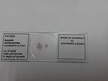 حيوان أولي (أسكارس) في صفيحة رقيقة من أجل المشاهدة المجهرية.تم إعداد هذا الحيوان الأولي في هذه الصفيحة بألمانيا، بينما تمت دراستها بكلية العلوم والتقنيات بفاس، والصورة ملتقطة من هناك.