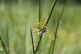 نبات عشبي معمر يشبه النجيليات. ينتشر بالجذامير وله سوق كثيرة من القاعدة. الساق أسطوانية رفيعة قائمة وخشنة. يصل ارتفاع النبات إلى متر ونصف. الأوراق رفيعة خيطية، ثنائية الشعب ينتهي كل فرع بواحدة إلى ثلاث. يميل النبات للون البني عند النضج. النورة الزهرية عشكولية يصل طولها إلى 20 سم. يزهر النبات في أواخر فصل الربيع.[5]