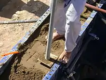 ُبنيت الجدران من القاع إلى أعلى مستوى في كل مرة، وقام العمال بضغط وحزم المواد في أقسام تتراوح طولها بين 50 و70 سم، وكانت كل واحدة منها ممسكة بالألواح الخشبية مؤقّتاً، وبمجرد تسوية المواد، يمكن إزالة القيود الخشبية وتكرار العملية على أعلى المستوى الذي سبق إنجازه. هذه العملية من السقالات الخشبية الأوليّة كثيرا ما تترك آثاراً في شكل صفوف متعددة من الثقوب الصّغيرة مرئية عبر وجه الجدران. وفي العديد من الحالات كانت الجدران مغطّاة بطلاء من الجير أو الجص، أو مواد أخرى لإعطائها سطحاً ناعماً ولحماية البنية الرئيسيّة بشكلٍ أفضل.