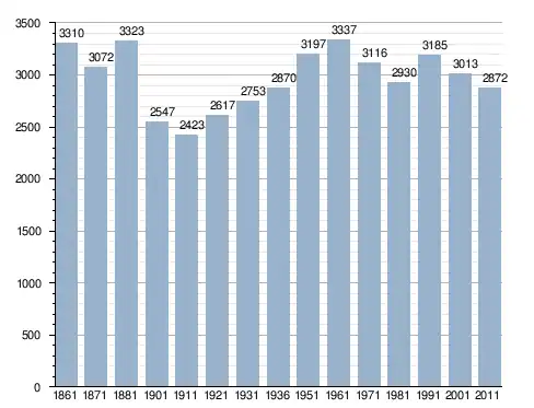 في سنة 1861 بلغ عدد السكان 3٬310 نسمة، وتطور العدد ليصل في سنة 2011 لـ 2٬872 نسمة.