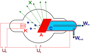 وتعمل كلتا الحالتين في صمام أشعة سينية، عند توصيل المهبط على تيار متناوب ومصدر جهد voltage قليلة، تنشأ الإلكترونات عند المهبط المتوهج (فتيل متوهج مثل فتيل اللمبة ) ثم تصطدم بالمصعد الموجب الشحنة فتنكبح بشدة. وعندئذ تنتج الأشعة السينية و 99 % من الطاقة الكهربائية المستخدمة تظهر على هيئة حرارة ليست مفيدة وفقط 1% من الطاقة يتحول إلى الأشعة السينية. ويحدث اصطدام الإلكترونات بإلكترونات ذرات معدن المصعد وتطيح بها خارج الذرة، ونظرا لأن الذرة لا تبقى طويلا خالية من أحد إلكتروناتها، فيمتلئ المكان الشاغر بإلكترون من خارج الذرة ويصدر مع هذا الانتقال شعاعا من الأشعة السينية ذا طول موجة محددة.