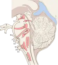 ![]() الأعصاب القحفيّة كما تجتاز قاعدة الجمجمة الأعصاب القحفيّة كما تجتاز قاعدة الجمجمة | |
