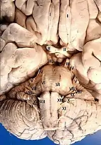 منظر بطني لدماغ خروف. تم تلوين مخارج أعصاب قحفيّة متنوعة باللون الأحمر