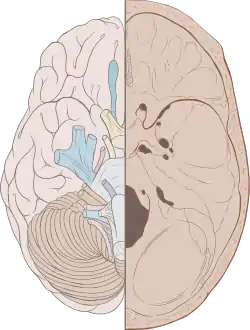 ![]() اليسار منظر للدماغ البشري من الأسفل، يُظهر منشأ الأعصاب القحفيّة. اليمين قاعدة الجمجمة مع الثُقَب التي تخرج من خلالها الأعصاب من الجمجمة. | |
