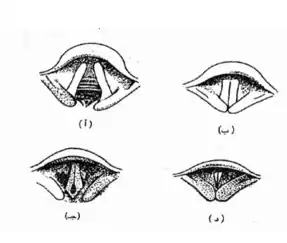 وهناك فراغ بين الوترين يسمى المزمار . وفتحة المزمار تنقبض وتنبسط بنسب مختلفة مع الأصوات ، ويترتب على هذا اختلاف نسبة شدة الوترين واستعدادهما للاهتزاز ؛ فكلما زاد توترهما زادت نسبة اهتزازهما في الثانية ، فتختلف تبعا لهذا درجة الصوت . وللمزمار غطاء نسميه لسان المزمار ، وظيفته الأصلية أن يكون بمثابة صمام يحمى طريق التنفس في أثناء عملية البلع.[9] ويكون الوتران الصوتيان في أوضاع متعددة ، هي المبينة فيما يأتي:[10]