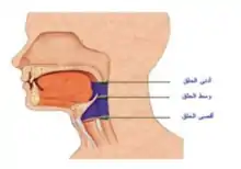 وهو الجزء الذي بين الحنجرة وأقصى الفم. وهو فضلا عن أنه مخرج لأصوات لغوية خاصة ، يستغل بصفة عامة كفراغ رنان يضخم بعض الأصوات بعد صدورها من الحنجرة ، فهو يسهم بفعالية في تشكيل سمة التفخيم الصوتي المائزة للأصوات المفخمة المتمثلة بكل من الضاد والطاء والظاء والصاد، فمع ارتفاع مؤخر اللسان باتجاه الطبق وارتداد جذره باتجاه الجدار الخلفي للحلق تتشكل سمة التفخيم التي تميز هذه المجموعة عن نظيرها المرقق. وينقسم الحلق إلى ثلاثة أجزاء هي أدناه ووسطه وأقصاه. [9]