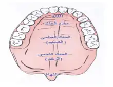 هو العضو الذي يتصل به اللسان في أوضاعه المختلفة . ومع كل وضع من أوضاع اللسان بالنسبة لجزء من أجزاء الحنك الأعلى تتكون مخارج كثير من الأصوات . وينقسم الحنك الأعلى إلى أقسام عدة هي :الأسنان ثم أصولها ، ثم وسط الحنك أو الجزء الصلب منه ، ثم أقصى الحنك أو الجزء اللين منه ، ثم اللهاة . [12]