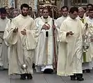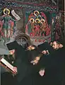 رجال دين أرثوذكس شرقيون يرنمون الترانيم البيزنطيَّة؛ تعد الموسيقى البيزنطية نظام موسيقي مسيحي عريق نشأت في البلاط الإمبراطوري في مدينة القسطنطينية.