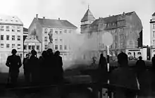 رجال الشرطة في الاقنعه الواقية من الغاز في اوستوفورور بعد تفريق الحشد بالغاز المسيل للدموع.