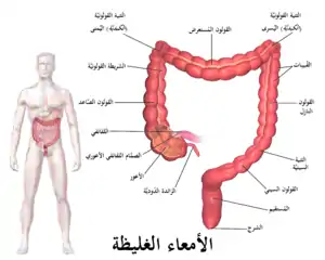 ![]() رسم للقولون كما يظهر من الأمام (يظهر الأعور ملونا باللون الأحمر) | |