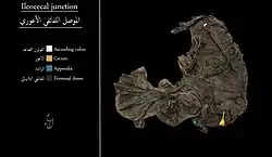 - شكل تشريحي: 39:05-09 على موقع مركز سوني دونستات الطبي (تشريح بشري عبر الإنترنت).—"The cecum with the distal portion of the ileum."