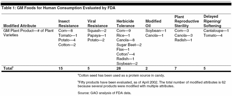 في الولايات المتحدة، يجب أن يكون مركز إدارة الاغذية والعقاقير لسلامة الأغذية والتغذية التطبيقية موافق على الخصائص الغذائية من الأغذية المعدلة وراثيا على أساس المقارنة بالأطعمة التقليدية المنتجة. ويبين الجدول أدناه الأطعمة التي تلقت موافقة هيئة FDA اعتبارا من عام 2002.[43]