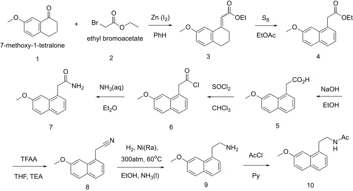 |CitationClass=تم تجاهله (مساعدة) - B. Tinant; J.-P. Declercq; J. H. Poupaert; S. Yous; D. Lesieur (1994). "N-[2-(7-Methoxy-1-naphthyl)ethyl]acetamide, a potent melatonin analog". Acta Crystallogr. C. 50 (6): 907–910. doi:10.1107/S0108270193012922. الوسيط