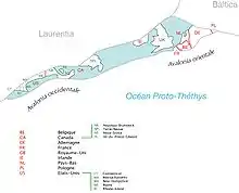 صخور كتلة الرئيسي للAvalonia من حيث صلتها السواحل الحديثة والحدود ولكن في المواقف النسبية كما كانت في نهاية الكربوني، قبل أن يفصل أوروبا وأمريكا الشمالية مرة أخرى. وترد أسماء بأشكالها الفرنسية.
