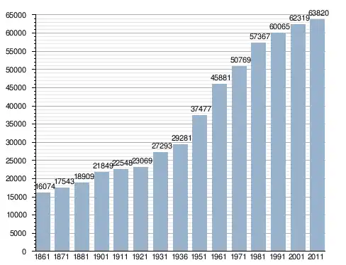 في سنة 1861 بلغ عدد السكان 16٬074 نسمة، وتطور العدد ليصل في سنة 2011 لـ 63٬820 نسمة.