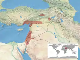 ينتشر هذا النوع في تركيا وسوريا ولبنان وفلسطين والأردن ويمتد إلى العراق وإيران.[4] تم العثور على هذا النوع في المناطق الصخرية قليلة النباتات من غابات الصنوبر والبلوط. يمكن العثور عليها أيضًا في البساتين والحدائق الريفية.[5]