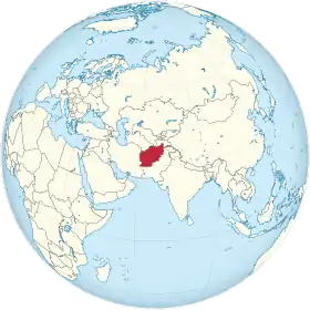 أفغانستان، رسميا جمهورية أفغانستان الإسلامية هي دولة حبيسة تقع في آسيا الوسطى، تحدها كل من طاجكستان وأوزبكستان وتركمانستان من الشمال وإيران من الغرب والصين من الشرق، فيما تحدها باكستان من الجنوب. ومعنى كلمة أفغانستان: هو أرض الأفغان،[21] وتعتبر إحدى نقاط الاتصال القديمة لطريق الحرير والهجرات البشرية السابقة. وتلك الدولة ذات الموقع جيوإستراتيجي تربط شرق وغرب وجنوب ووسط آسيا،[22] وهي موطن لكثير من الأمم القديمة والحديثة خلال العصور المتتالية. وكانت المنطقة هدفا لكثير من الشعوب الغازية والفاتحين منذ القدم، منذ عهد الإغريق تحت حكم الإسكندر الأكبر، ومرورا بالفتوحات الإسلامية وحكم المغول وغيرهم. وقد كانت أفغانستان منبع للعديد من الممالك، مثل مملكة باكتريا الإغريقية والكوشانيون والهياطلة والصفاريون السامانيون والغزنويون التيموريون، وممالك أخرى ظهرت في أفغانستان فشكلت دولا عظمى هيمنت على جيرانها من الممالك الأخرى.[23]