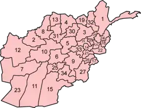 تتألف أفغانستان - إداريا- من 34 ولاية، مع وجود كل محافظة عاصمتها الخاصة وإدارة المحافظات. تنقسم المحافظات إلى مناطق حول المقاطعة 398 أصغر، كل منها يغطي عادة المدينة أو عدد من القرى. ويمثل كل دائرة من قبل حاكم المقاطعة.