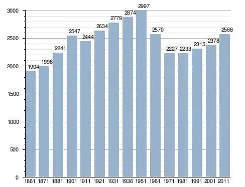 في سنة 1861 بلغ عدد السكان 1٬904 نسمة، وتطور العدد ليصل في سنة 2011 لـ 2٬568 نسمة.