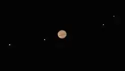 | 5 | I | آيو | ˈaɪ.oʊ | ![]() | 3,660.0×3,637.4 ×3,630.6 | 8,931,900 | 421,700 | +1.769 137 786 | 0.050°[5] | 0.0041 | 1610 | جاليليو جاليلي | أقمار غاليليو |