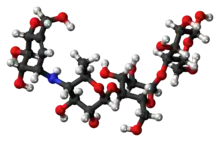 | (2R,3R,4R,5S,6R)-5-{[(2R,3R,4R,5S,6R)-5- {[(2R,3R,4S,5S,6R)-3,4-dihidroksi-6-metil- 5-{[(1S,4R,5S,6S)-4,5,6-trihidroksi-3- (hidroksimetil)cikloheks-2-en-1-il]amino} tetrahidro-2H-piran-2-il]oksi}-3,4-dihidroksi- 6-(hidroksimetil)tetrahidro-2H-piran-2-il]oksi}- 6-(hidroksimetil)tetrahidro-2H-piran-2,3,4-triol | |
