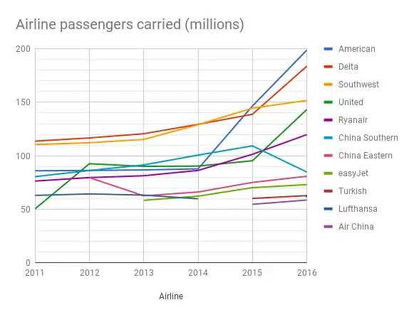 | 3 | الخطوط الجوية المتحدة | 329,562 | 299,080 | 294,970 | 287,547 | 286,802 | 288,282 | 160,270 | |