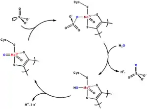 ![]() آلية مقترحة لأكسدة الكبريتيت إلى كبريتات عبر أكسيداز الكبريتيت |