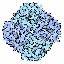 أكوابورين الأكوابورينات (بالإنجليزية: Aquaporin)، وتسمى أيضًا قنوات الماء، هي بروتينات من عائلة كبيرة من البروتينات الداخلية الرئيسية التي تشكل مسامًا في غشاء الخلايا الحية، مما يسهل نقل الماء بين الخلايا بشكل أساسي.[1] تحتوي أغشية الخلايا لمجموعة متنوعة من البكتيريا والفطريات والخلايا الحيوانية والنباتية على أكوابورينات يمكن للمياه أن تتدفق من خلالها بسرعة أكبر داخل وخارج الخلية أكثر من الانتشار عبر طبقة ثنائية الفوسفوليبيد (غشاء الخلية).[2] تحتوي الأكوابورينات على ستة مجالات حلزونية ألفا تغطي الأغشية مع كل من النهايات الكربوكسيلية والأمينية على الجانب السيتوبلازمي. تحتوي حلقتان كارهتان للماء على شكل NPA محفوظ من الأسباراجين والبرولين والألانين والذي يشكل برميلًا يحيط بمنطقة تشبه المسام المركزية التي تحتوي على كثافة بروتينية إضافية. نظرًا لأن الأكوابورينات عادةً ما تكون مفتوحة دائمًا ومنتشرة في كل نوع من الخلايا تقريبًا، فإن هذا يؤدي إلى سوء فهم مفاده أن الماء يمر بسهولة عبر غشاء الخلية تحت تدرج تركيزه. يمكن أن يمر الماء عبر غشاء الخلية من خلال الانتشار البسيط لأنه جزيء صغير، ومن خلال التناضح، في الحالات التي يكون فيها تركيز الماء خارج الخلية أكبر من تركيزه داخلها. ومع ذلك، نظرًا لأن الماء هو جزيء قطبي، فإن عملية الانتشار البسيطة هذه بطيئة نسبيًا، وتمر غالبية الماء عبر الأكوابورين.[3][4][5]