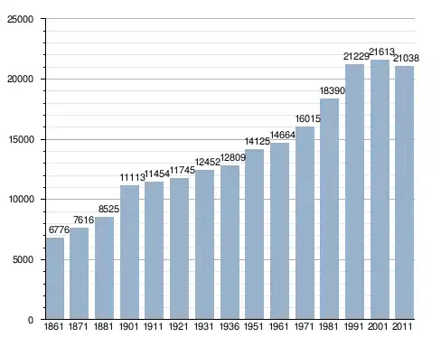 في سنة 1861 بلغ عدد السكان 6٬776 نسمة، وتطور العدد ليصل في سنة 2011 لـ 21٬038 نسمة.