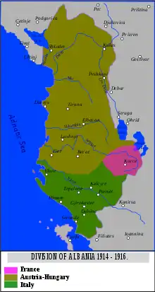 في مايو 1916دخل الفيلق السادس عشر الإيطالي بقوات عددها 100.000ألف رجل تحت قيادة الجنرال سيتيميو بياكينتى إلى منطقة جنوب ألبانيا وسيطر عليها بحلول خريف عام 1916. في حين احتل الجيش الفرنسي كورتشي والمناطق المحيطة بها يوم 29 نوفمبر 1916. حيث استقرت القوات الإيطالية في غيروكاستر والقوات الفرنسية في كورتشي، ووفقا إلى التطورات الجديدة على جبهة البلقان دخلت جمهورية ذاتية الحكم السابقة إيبيروس الشمالية (التي تسيطر عليها الأقلية اليونانية) في خريف عام 1916 إلى الأراضي الالبانية مرة أخرى بعد الموافقة على الاتفاق الثلاثي بين إيطاليا وفرنسا واليونان.[9]