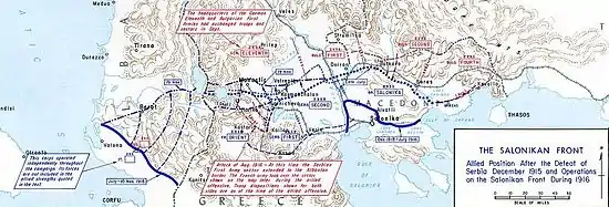 جبهة مقدونيا كانت هذه الجبهة معروفة أيضا باسم جبهة سالونيك والتي تشكلت في الحرب العالمية الأولى نتيجة محاولة من جانب دول الحلفاء لمساعدة الجيش الصربى المنسحب. حيث كان الحلفاء لهم على تحريك الجيش الصربي من كورفو إلى مناطق في اليونان حيث في نهاية المطاف تأسست جبهة مستقرة، وتمتد من ساحل البحر الادرياتيكي الألباني حتى نهر ستروما، وهجوم قوات الحلفاء ضد الجيش البلغاري الذي كان في أوقات مختلفة عزز قواته مع وحدات أصغر من قوات الامبراطورية النمساوية-المجرية المتبقية. حيث بقيت الجبهة المقدونية مستقرة تماما وعلى الرغم من التغيرات المحلية التي حدثت حتى هجوم الحلفاء الكبير في سبتمبر 1918.